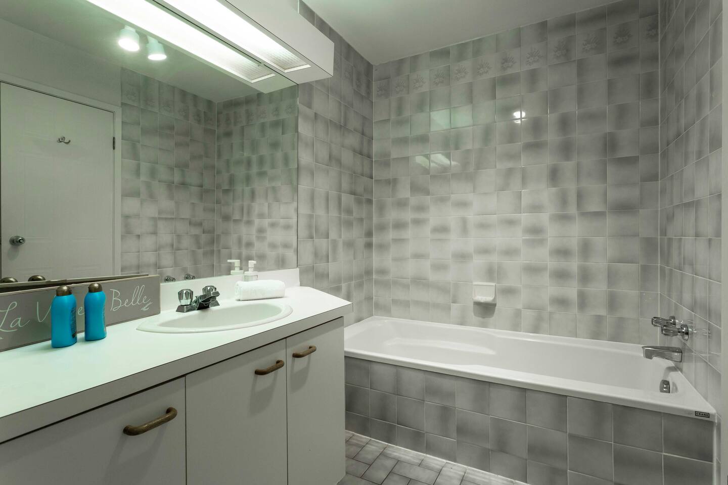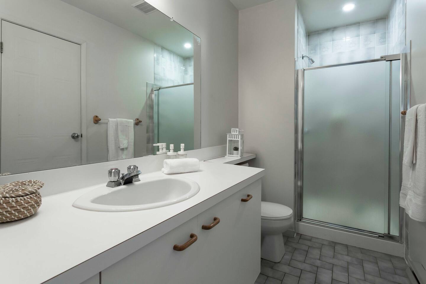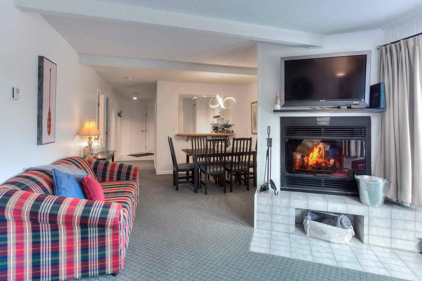 Vous entrez dans un espace chaleureux et accueillant, entouré d'une vue à couper le souffle sur la piste de ski et la station. Vous vous sentez immédiatement chez vous, tandis que la cheminée au bois crépite devant vous. Le balcon enveloppant vous invite à vous asseoir et à admirer la beauté du paysage environnant. En parcourant la salle à manger et le salon à aire ouverte, vous découvrez deux grandes chambres situées à chaque extrémité de la pièce, chacune avec sa propre salle de bain complète et un accès facile. Choisissez entre le lit king luxueux dans une chambre ou le lit queen douillet dans l'autre. Si vous avez des invités supplémentaires, ils peuvent facilement s'installer dans le salon grâce au canapé-lit prêt à l'emploi. La cuisine est entièrement équipée avec tous les équipements modernes dont vous avez besoin : réfrigérateur, cuisinière, lave-vaisselle et micro-ondes, ainsi que toute la vaisselle, casseroles, poêles et ustensiles nécessaires pour préparer un délicieux repas. Cet espace offre vraiment tout ce qu'il faut pour un séjour relaxant et ressourçant à la montagne.