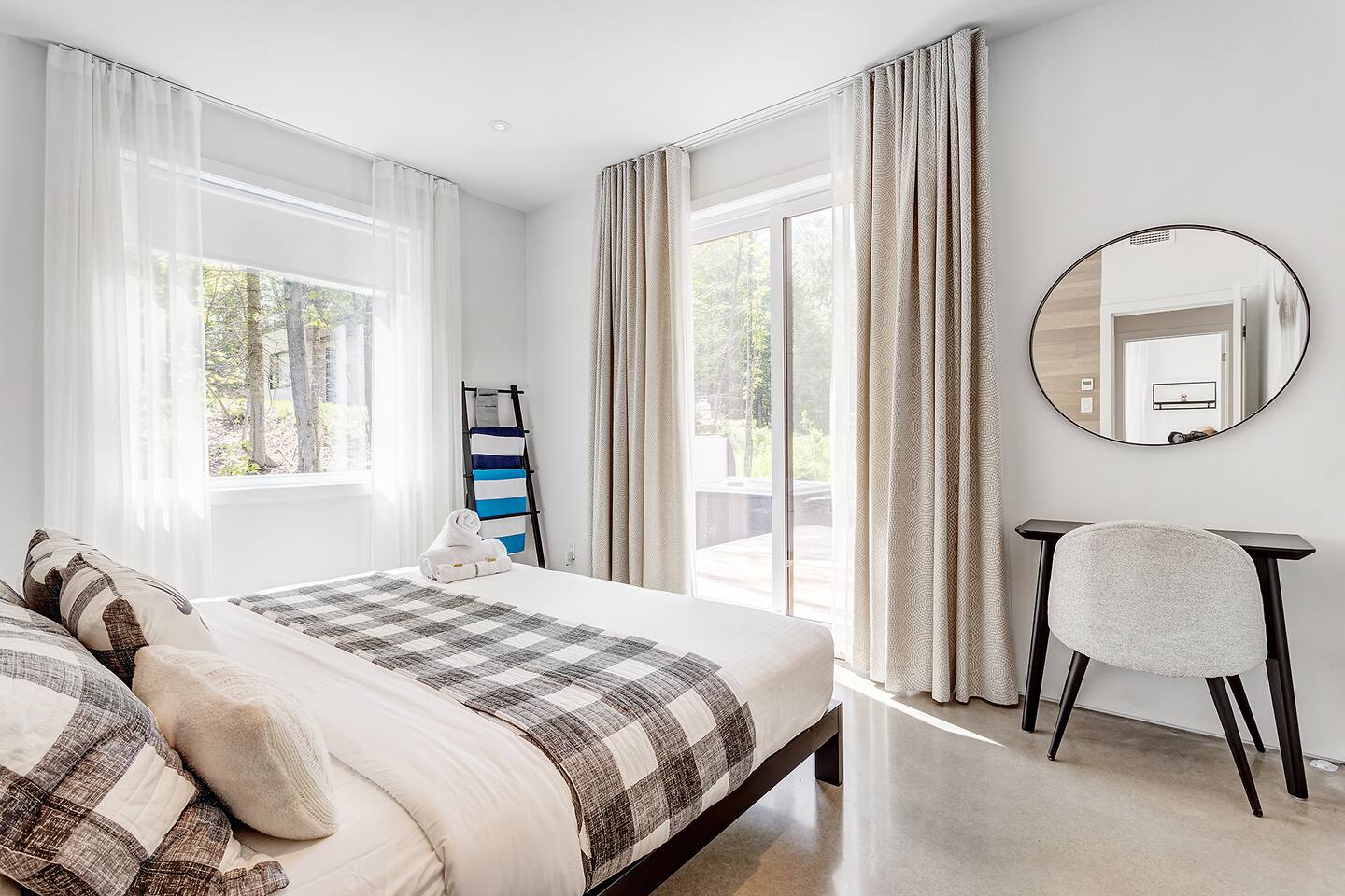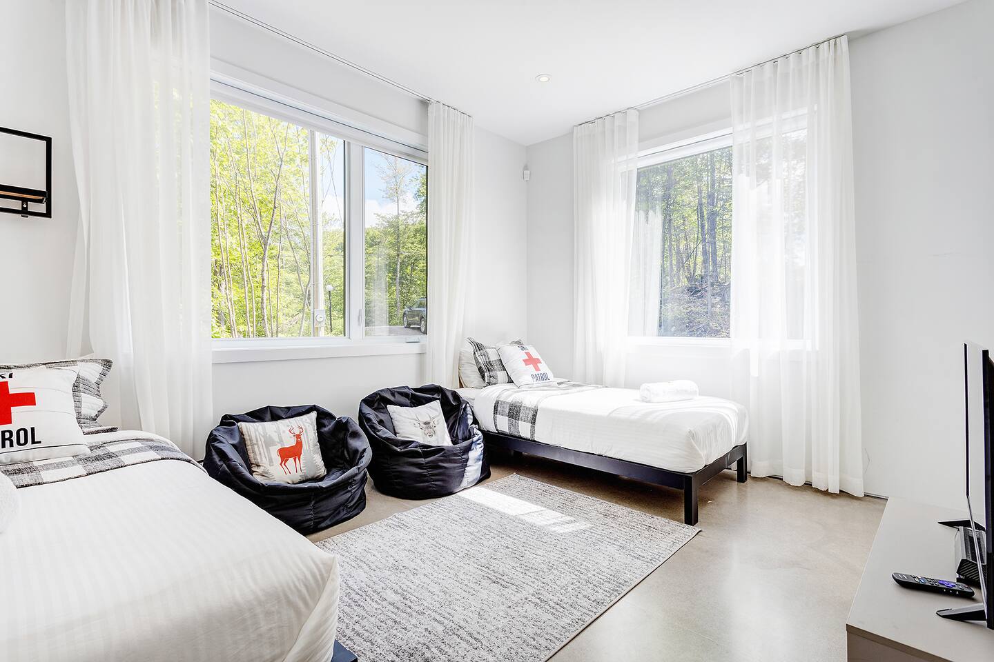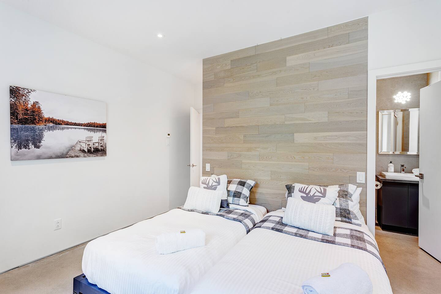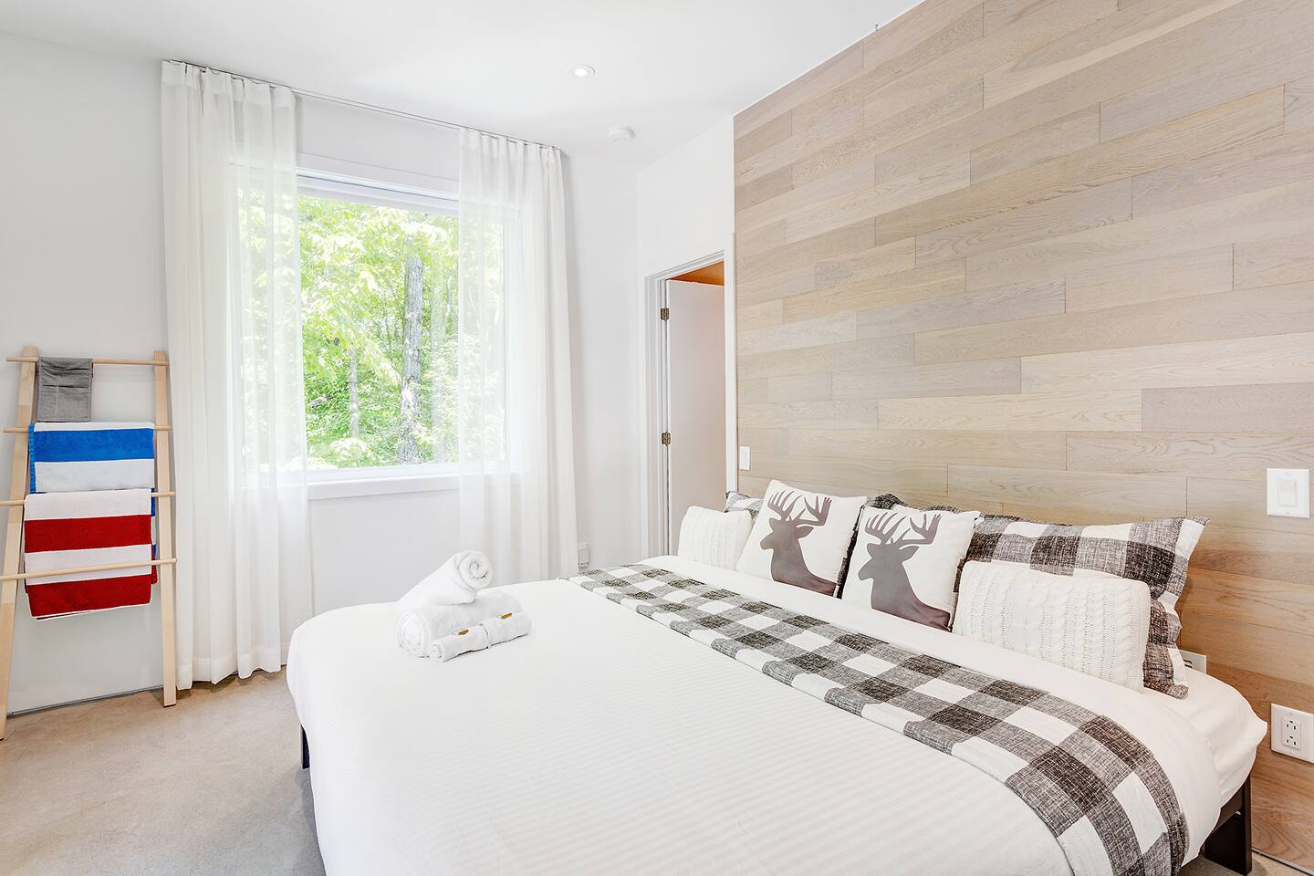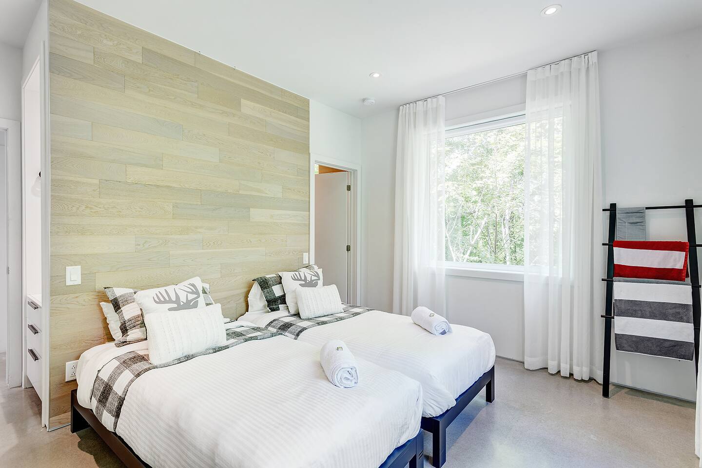 Chalet moderne pour 8 personnes 4 chambres 3 salles de bain Borne de recharge pour véhicule électrique (jusqu'à 40 ampères) avec prise J1772 Cuisine gastronomique entièrement équipée (Nespresso/Keurig/Raclette et plus) Filtre à eau UV pour toute la maison Salle à manger Salon avec télé intelligente, Netflix, Bell Fibe, Crave & HBO Salle enfants/ados avec télé intelligente + XboxOne BBQ Spa Foyer Planchers chauffants radiants Internet haute vitesse Haut-parleurs au plafond avec Spotify Stationnement privé (4 voitures) À 10 min en voiture de Mont-Tremblant (vue sur la montagne depuis le chalet) Entrez dans le chalet et laissez-vous séduire par l'élégance moderne et l'espace. L'intérieur est magnifiquement conçu et soigneusement aménagé avec toutes les commodités nécessaires pour un séjour inoubliable. L'espace marie le style de vie moderne à la beauté de la nature. L'intérieur, créé par le célèbre bureau de design Dafnadesigns®, met en valeur des éléments naturels et écologiques qui s'harmonisent parfaitement avec l'extérieur. Minimaliste mais élégant, la maison est meublée et équipée pour mettre en valeur la beauté environnante. Commencez vos matinées avec nos machines à café Nespresso et Keurig ; préparez de délicieux repas dans notre cuisine ultramoderne avec plaque à induction et four mural autonettoyant ; un véritable rêve pour les passionnés de cuisine. Rassemblez-vous autour de la table de salle à manger éclairée par un lustre moderne "Nemo Crown Plana" conçu par Jehs + Laub et inspiré du concept de continuité de M.C. Escher. La cuisine ouverte sur le salon offre des vues spectaculaires grâce à de grandes fenêtres du sol au plafond qui fusionnent l'intérieur et l'extérieur. Profitez de soirées cocooning devant le magnifique foyer en pierre, en regardant vos émissions préférées sur la Smart TV équipée de Bell Fibe et Netflix. Le salon spacieux et accueillant s'ouvre sur une grande terrasse (850 pi²), avec spa, salon extérieur, table à manger et chaises longues pour bronzer. Que vous souhaitiez profiter du soleil, vous détendre le soir avec un cocktail ou partager un repas en famille autour du barbecue, notre terrasse extérieure répondra à toutes vos envies. Préparez-vous à passer des nuits paisibles dans l'une de nos quatre chambres spacieuses et confortables. Chaque chambre est équipée de matelas hybrides en latex de Literie Laurier, pour un repos optimal. Deux chambres disposent de lits king-size et d'une salle de bain attenante moderne avec douche pluie et accès direct à la terrasse extérieure. Les deux autres chambres offrent la flexibilité de deux lits simples ou d'un lit king-size, et partagent une salle de bain complète moderne avec baignoire. Restez confortable toute l'année grâce à des systèmes de chauffage et climatisation à la fine pointe. Le chauffage au sol radiant est contrôlable dans chaque pièce, avec chauffage d'appoint dans les salles de bain pour un confort maximal. Deux thermopompes centrales contrôlent séparément les ailes gauche et droite du chalet. Et pour respirer l'air pur de la nature, l'échangeur d'air fournit un apport continu d'air frais extérieur. Nous avons hâte que vous découvriez l'équilibre parfait entre luxe moderne et beauté naturelle dans notre oasis de Tremblant. Faites de ce chalet votre chez-vous, profitez-en, détendez-vous et créez des souvenirs inoubliables !