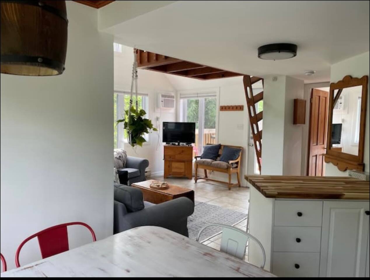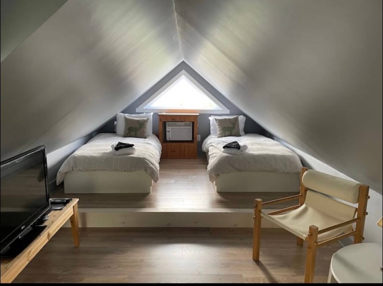 There is 1 bedroom (queen bed) on main level and a secondary large room on the second level that is accessed by ladder and features a queen bed and 2 singles.