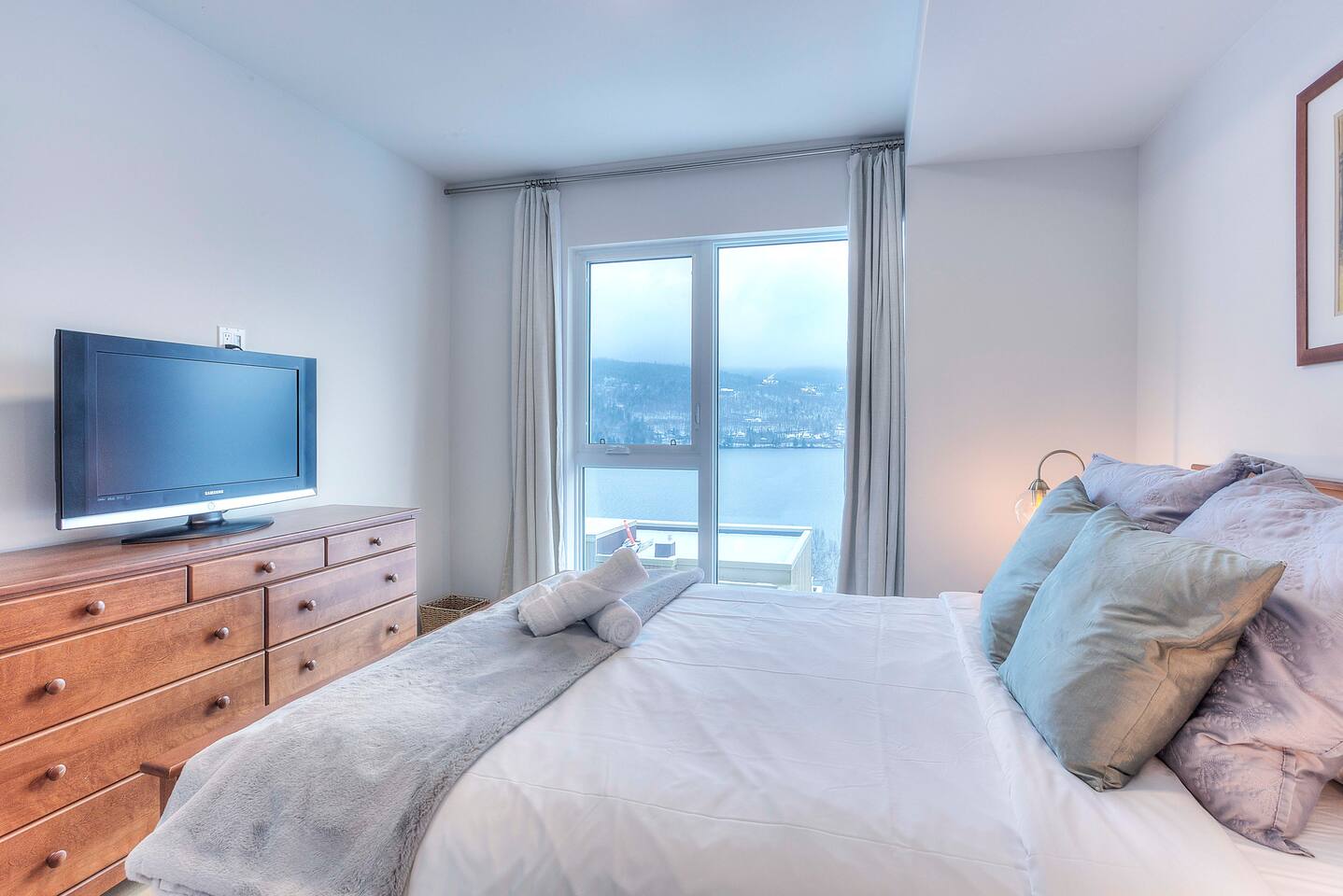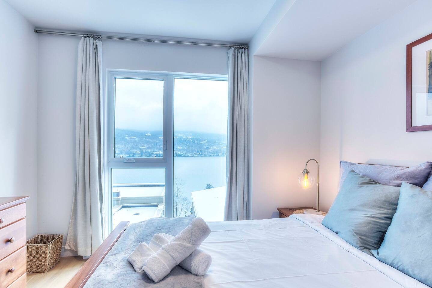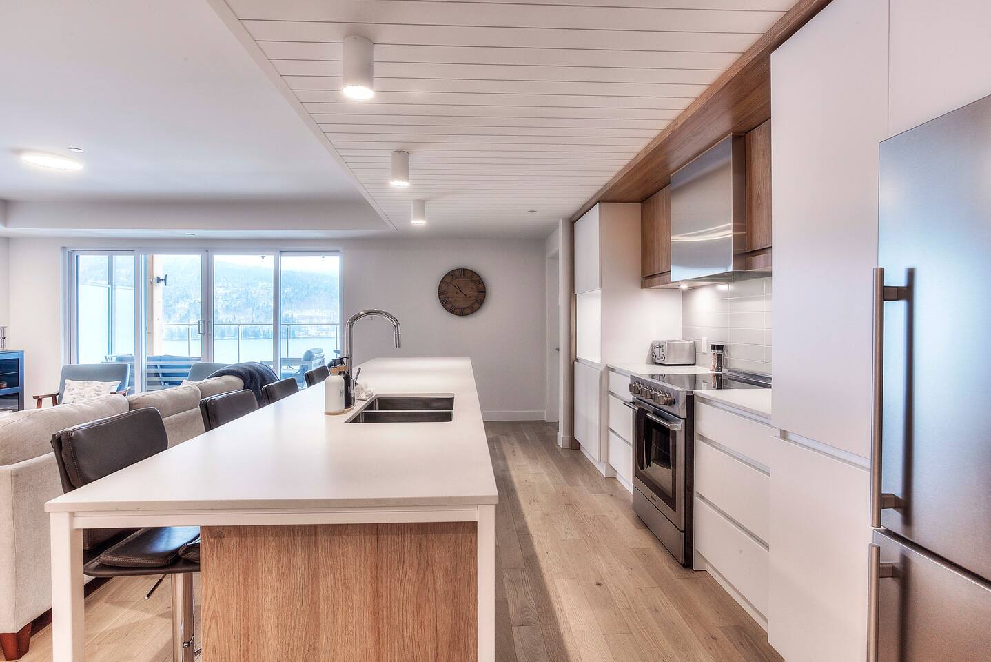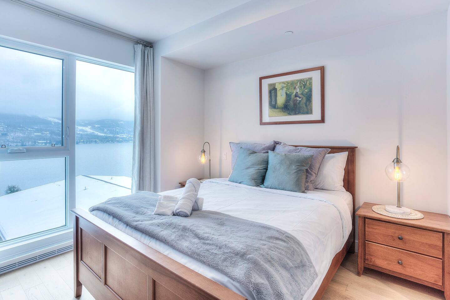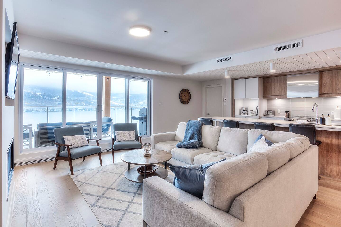 This condo offers three spacious bedrooms, each carefully designed and tastefully decorated to provide a sense of comfort and relaxation. Whether you're looking for a peaceful night's sleep or a cozy retreat, you'll find it in these well-appointed spaces. The state-of-the-art appliances in the gourmet kitchen offer convenience and sophistication, while the large dining area is perfect for hosting memorable gatherings with family and friends, creating lasting moments in a space that exudes modern elegance. The stunning outdoor, private terrace seamlessly connects to the inside living space, allowing you to bring the outdoors in by offering unobstructed mountain and lake views that will leave you in awe. Welcome to your own piece of paradise, where the views are boundless, and the memories are limitless. As guests you also have access to the shared pool table, fuse ball and gym/fitness center located in the building. - Access to the lake via a dock and private beach.