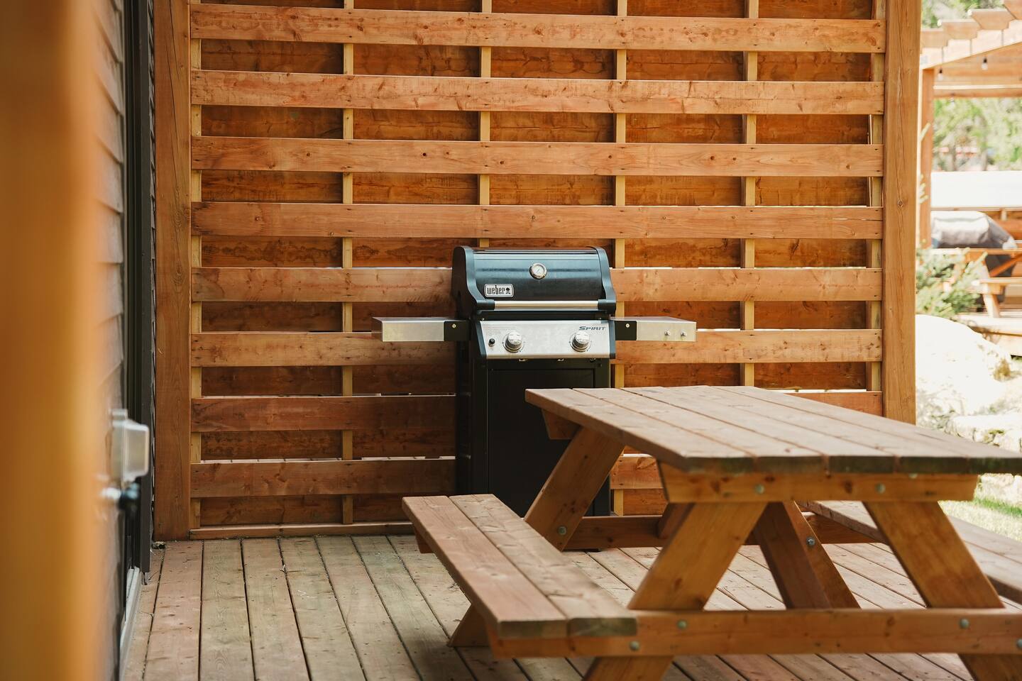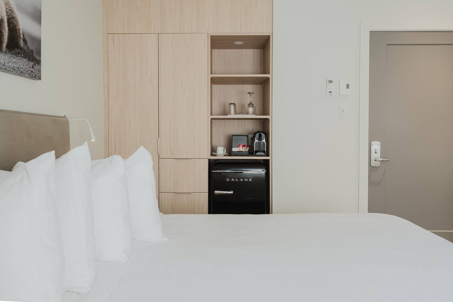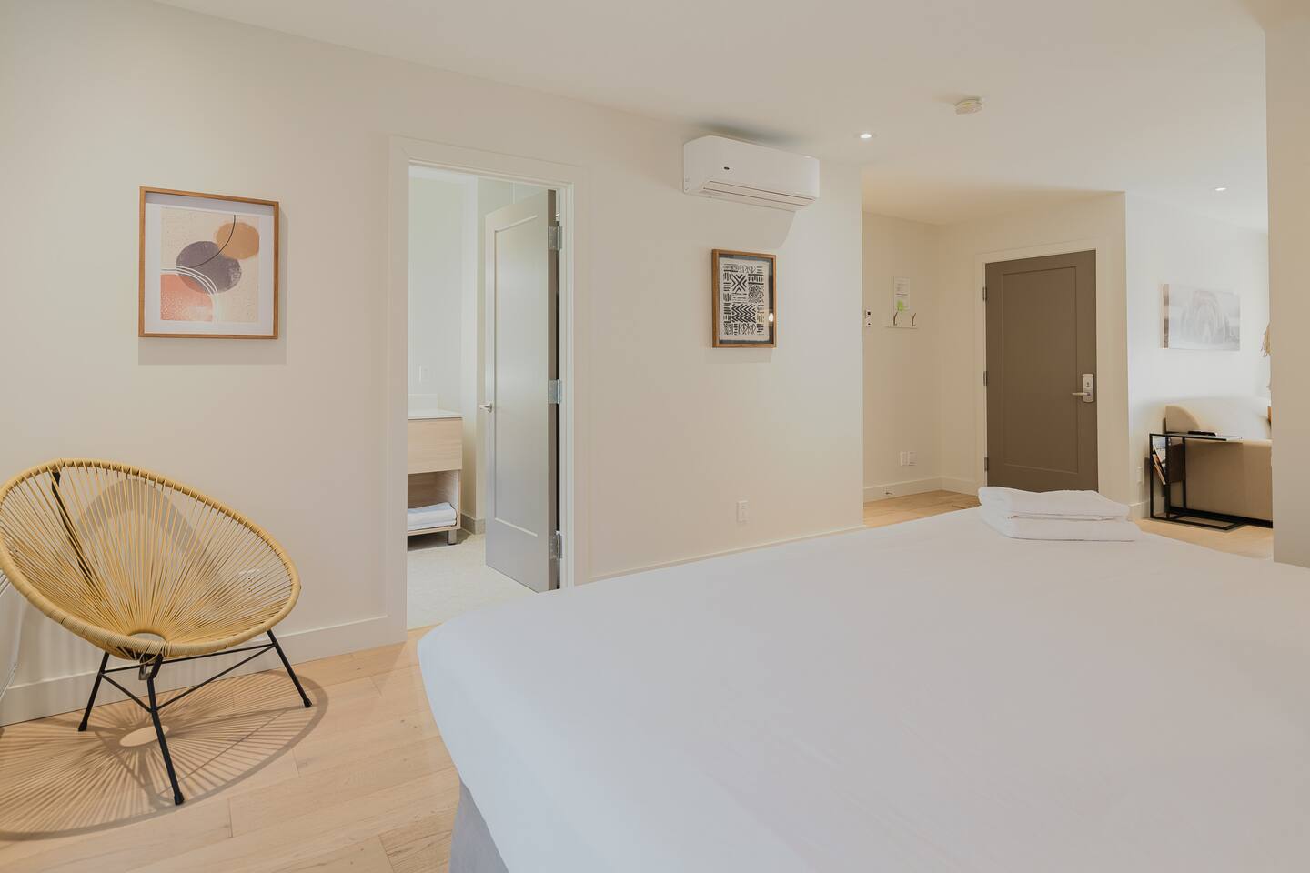 The townhouse consists of three separate rooms. All with king beds, Flat screen TV, individual AC units, mini fridge and a full ensuite bathroom in each. The main floors studio suite has additional living space for all to share, with a cozy living area and fireplace, small dining nook and a kitchenette. Patio doors that lead you out to the balcony.