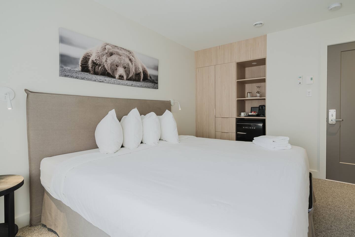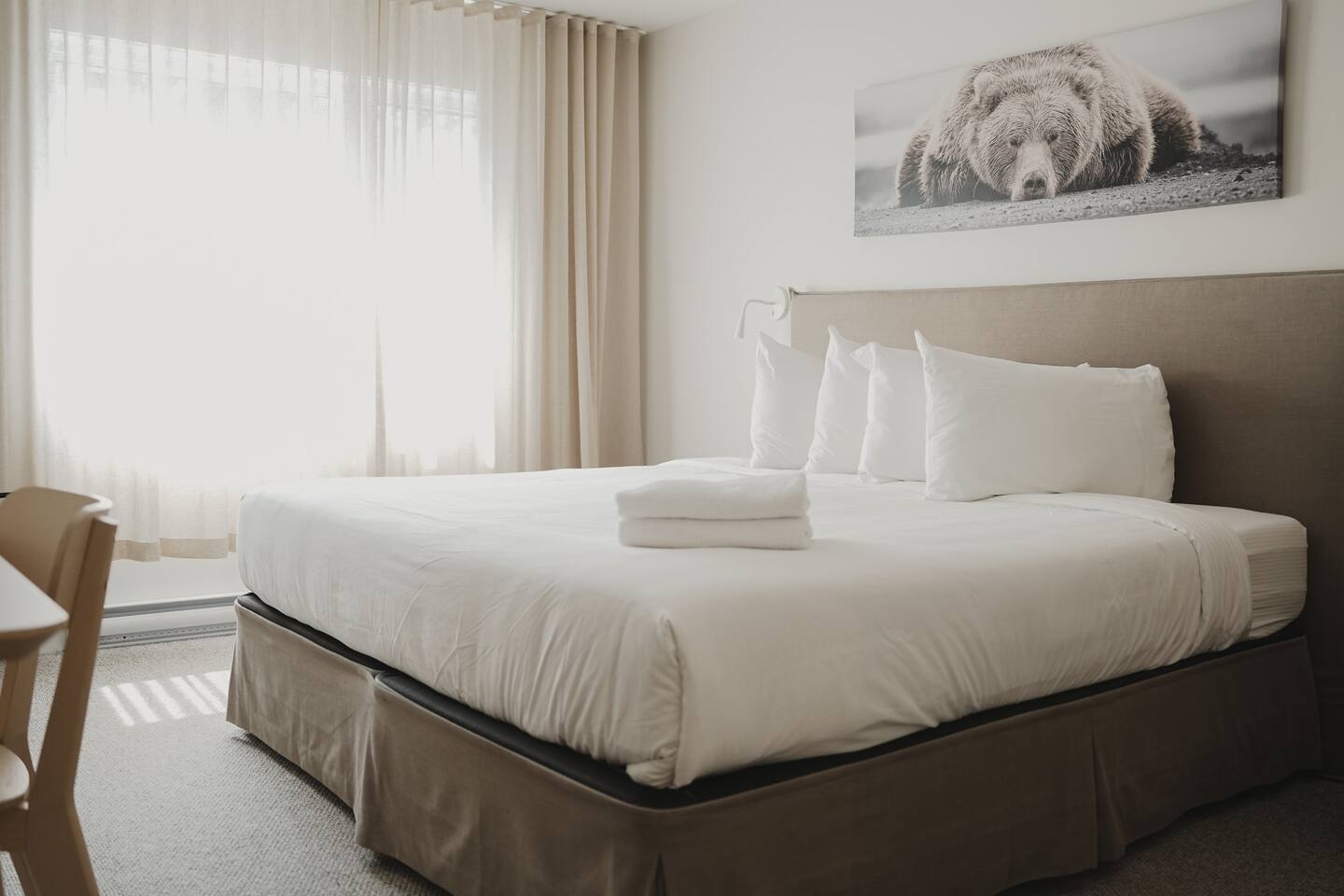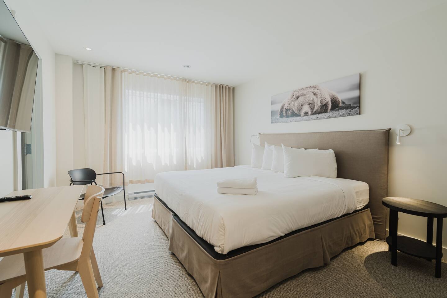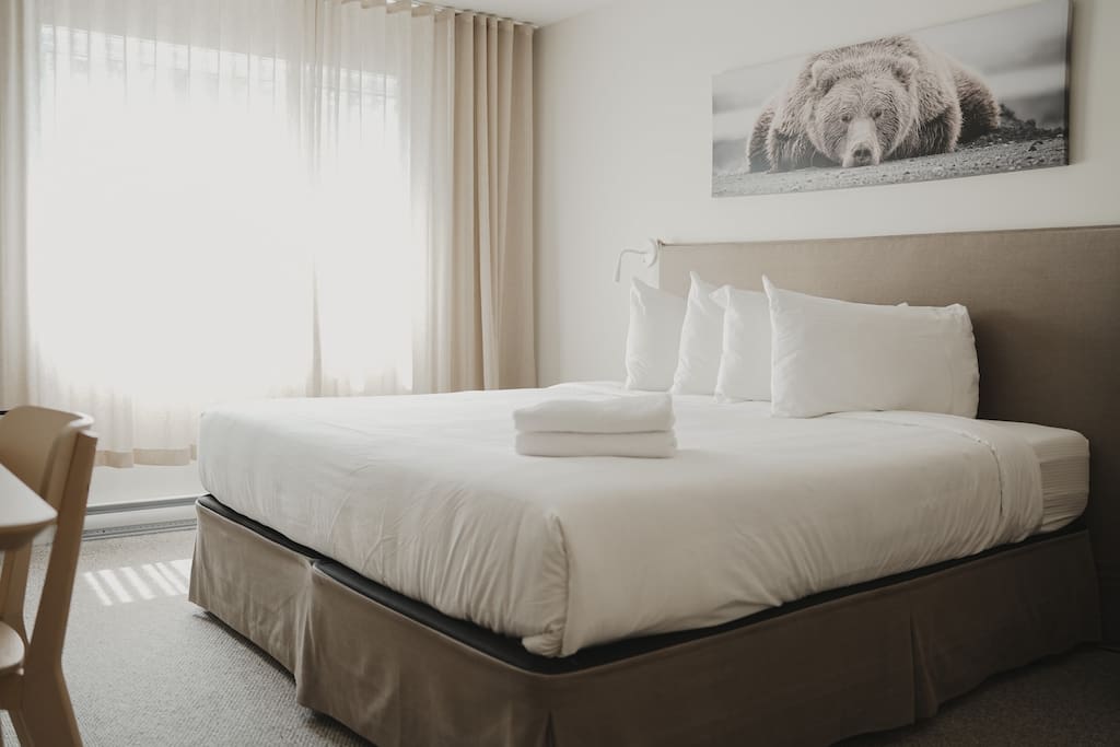 Welcome to your peaceful Mont-Tremblant getaway! This beautiful, modern resort room offers the perfect blend of comfort and convenience, featuring a luxurious king-size bed, private bathroom, and bright, airy design. Nestled within a resort-style building, guests enjoy access to the lake and the many trails that surround it — ideal for relaxing walks, hikes, or simply soaking up the natural beauty of Tremblant.
