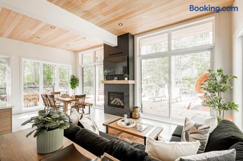 CITQ:318470 exp:2026-05-14 Enjoy modern amenities, including air conditioning, honed cement heated floors, generator, high-speed internet, smart TVs in every room, as well as a herb garden outside. Our fully equipped kitchen and cozy living area featuring wall to wall windows ,natural wood planked ceilings and a stunning central fireplace , are sure to create the perfect space for unwinding and making lasting memories. Our pet-friendly property ensures your furry friends can join in the relaxation, with a pet spa available for grooming. Located just 15 mins from Tremblant ski slopes and resort. Surrounded by scenic walking and cycling trails and access to Rivière Rouge for kayaking, you'll have endless opportunities to connect with nature. After a peaceful hike, return to our outdoor oasis . Whether soaking in the hot tub under the stars , lounging around the fire pit, or detoxifying in the sauna, the soothing ambiance will melt your stresses away and leave you feeling rejuvenated.
